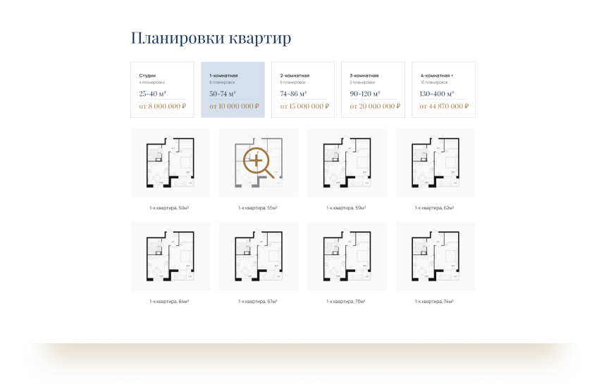 При фильтрации объектов в определенной категории, например, «Квартиры», при выборе района меняется фоновое изображение — это реальное фото этого района.