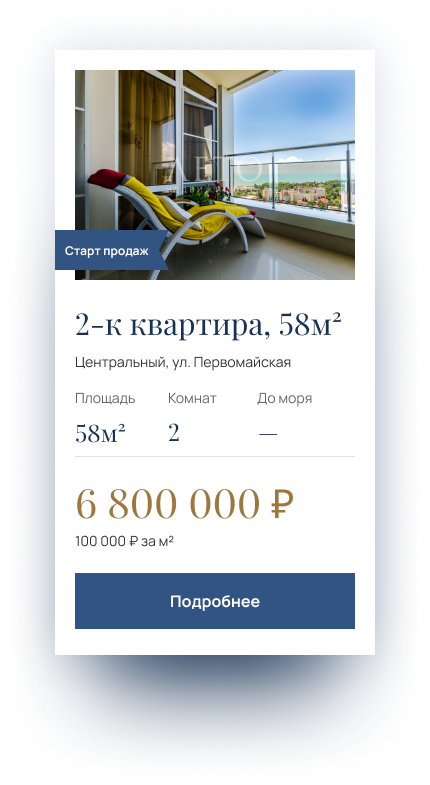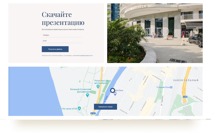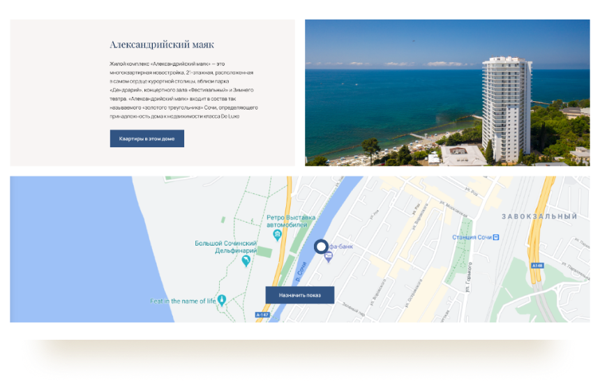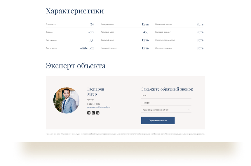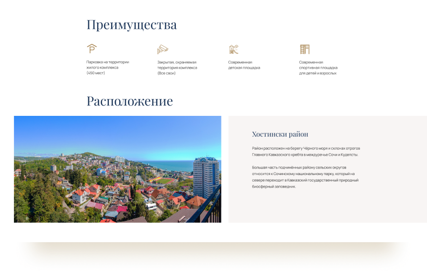 Для промостраницы объекта мы создали отдельную лендинговую страницу, на которой красиво описаны все преимущества объекта. Такие страницы заказчик может собирать самостоятельно с помощью нашего конструктора лендингов.