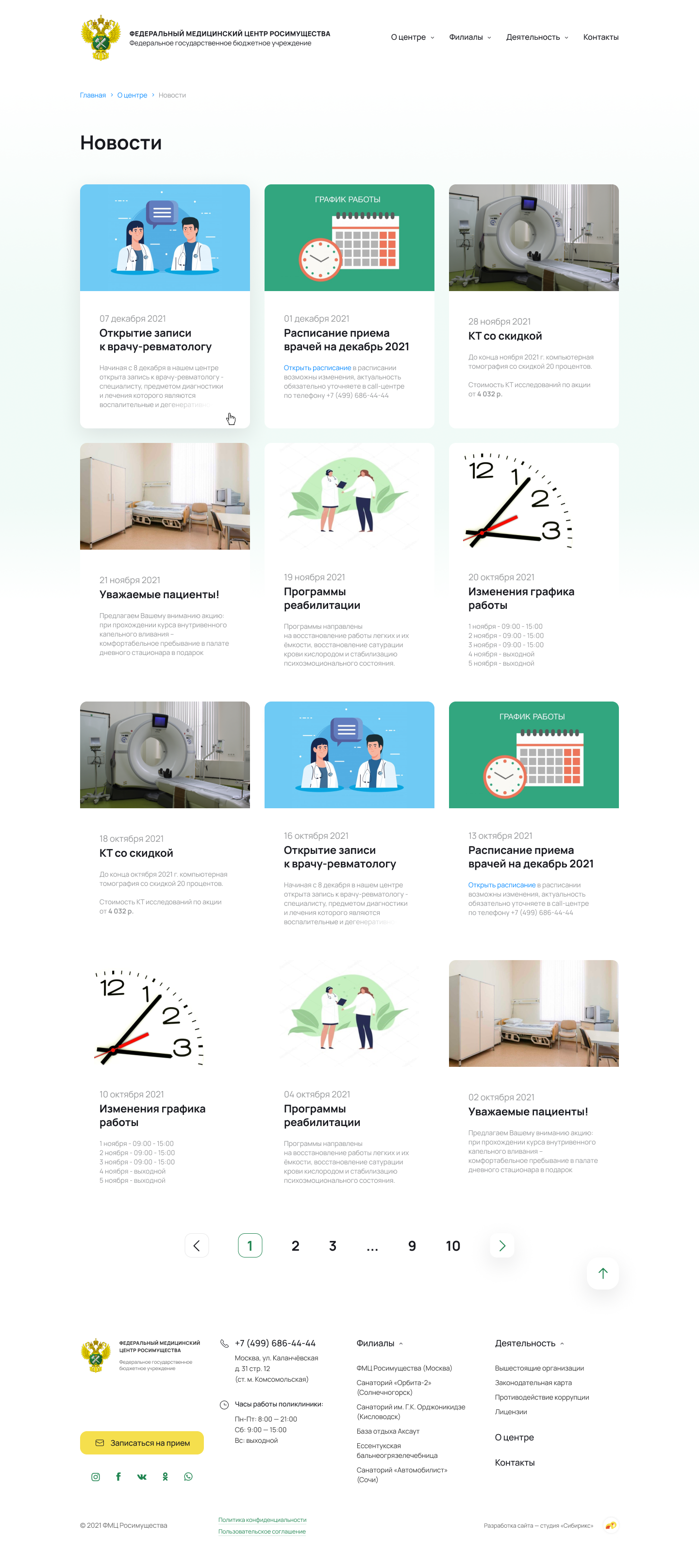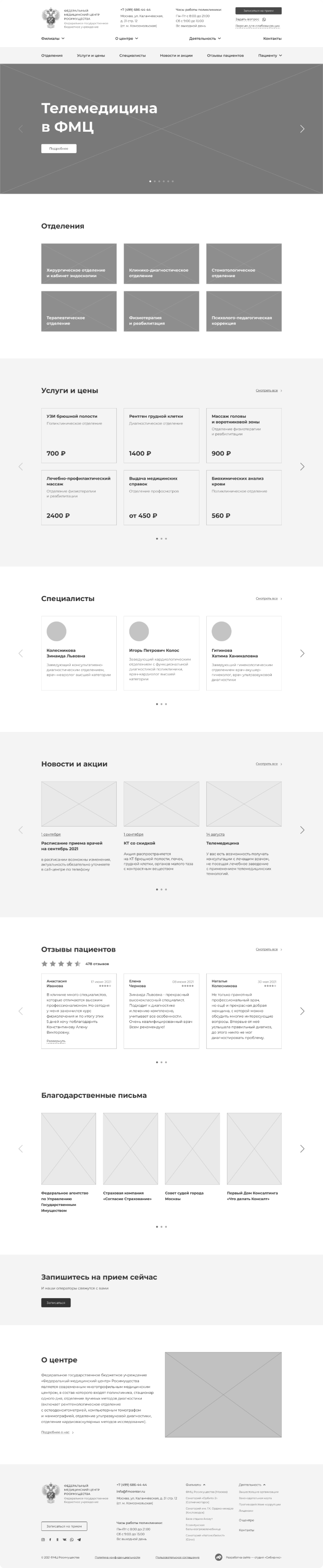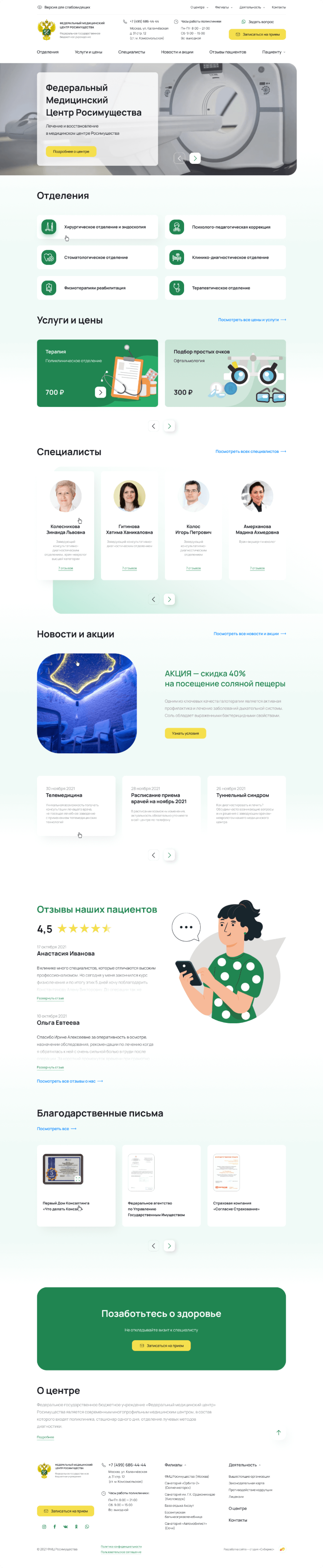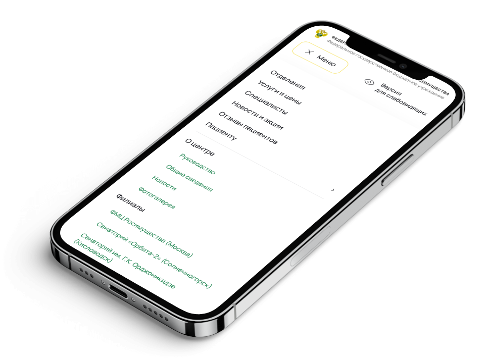 У медицинского центра — свои разделы: перечень отделений, услуги с ценами, запись к специалистам и новости. По факту это — отдельный сайт, который нужно было вписать в текущий. Чтобы пользователь не запутался, на странице центра мы добавили дополнительную навигационную шапку с ключевыми разделами.