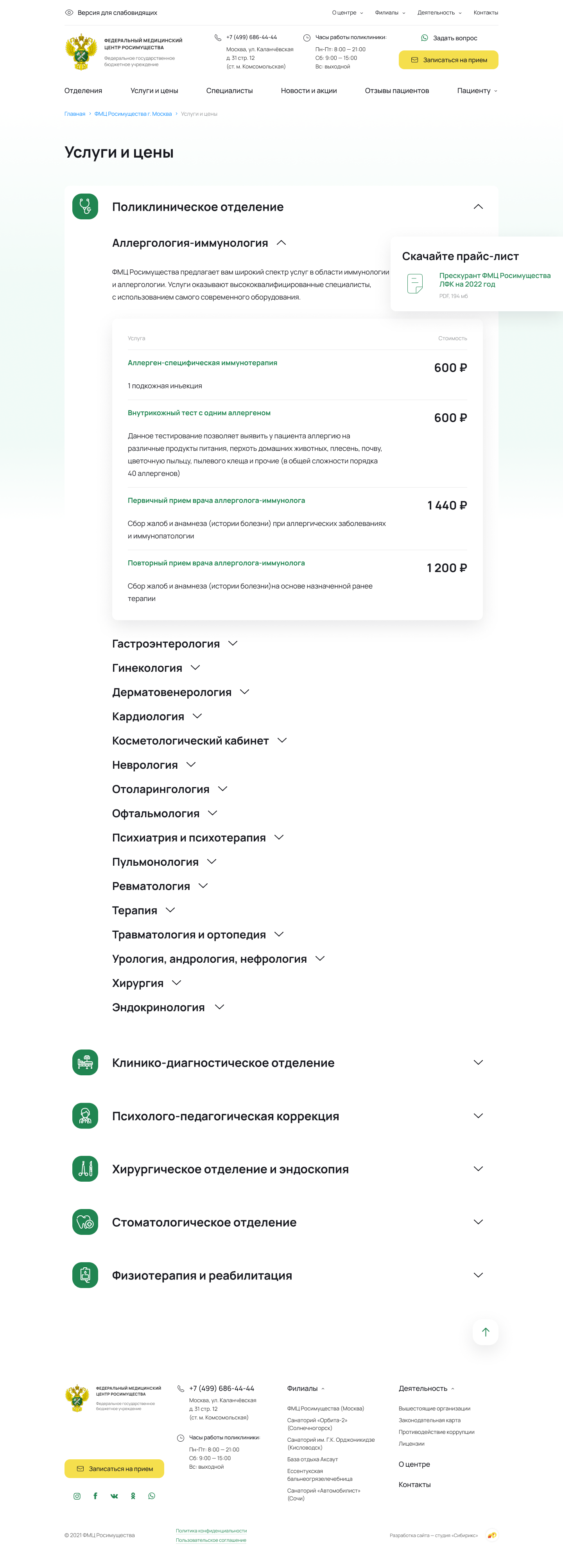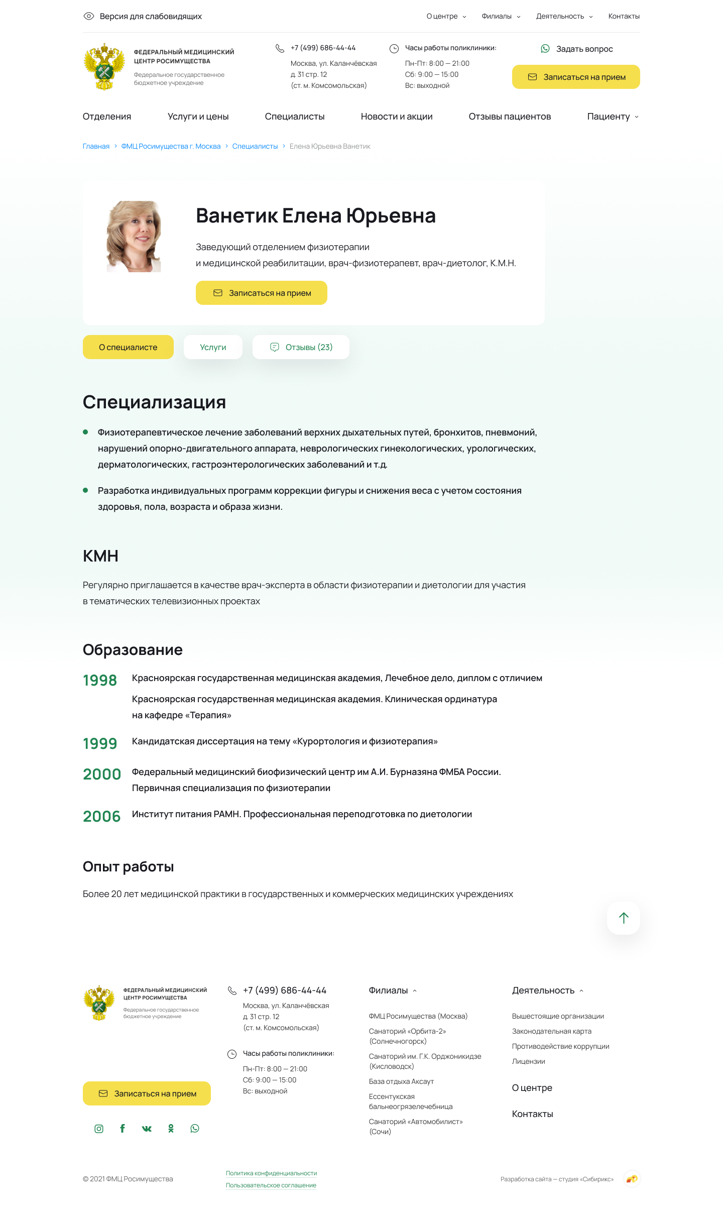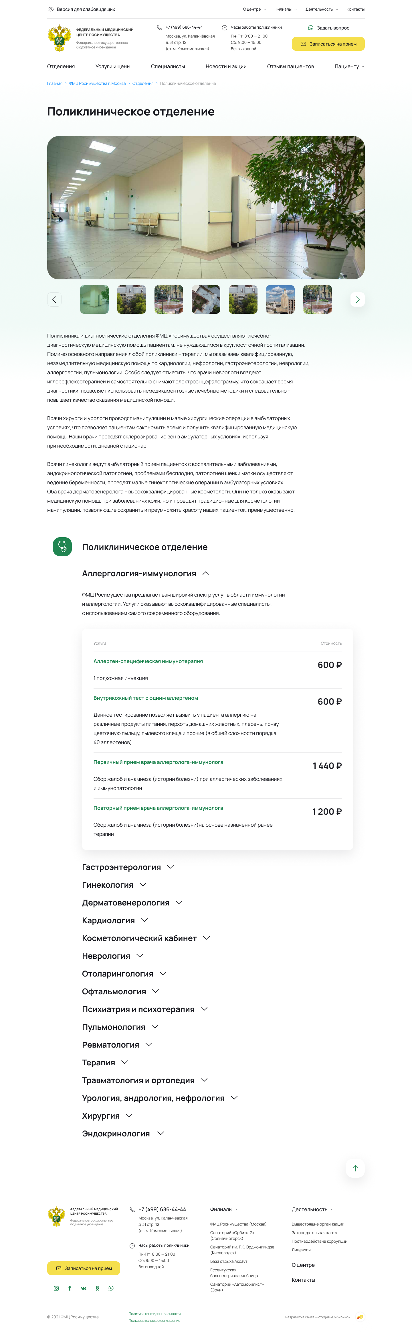 У медицинского центра в Москве — своя структура раздела: здесь и перечень отделений, и запись к специалистам, и свои новости. У каждого отделения центра — свой раздел с описанием услуг, специалистов и собственным прайсом.