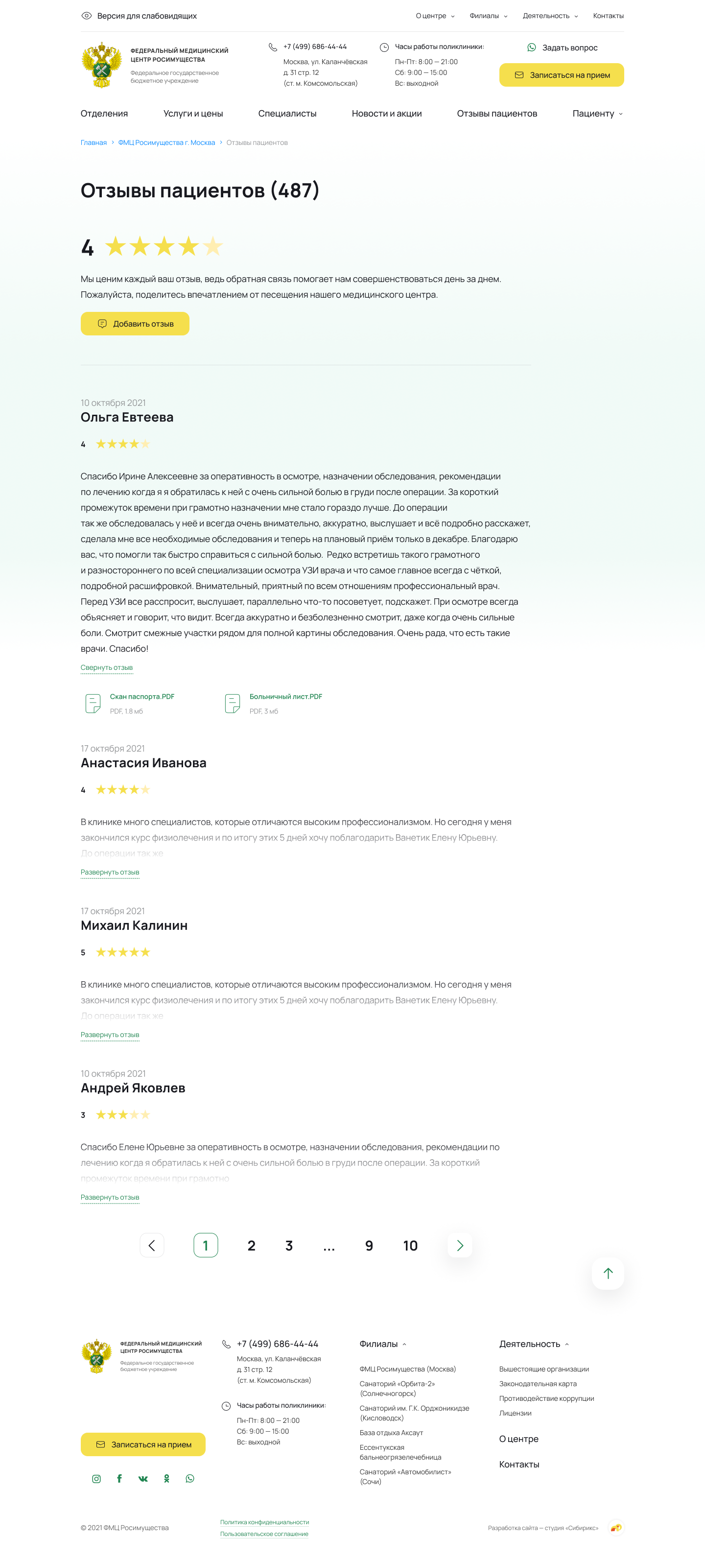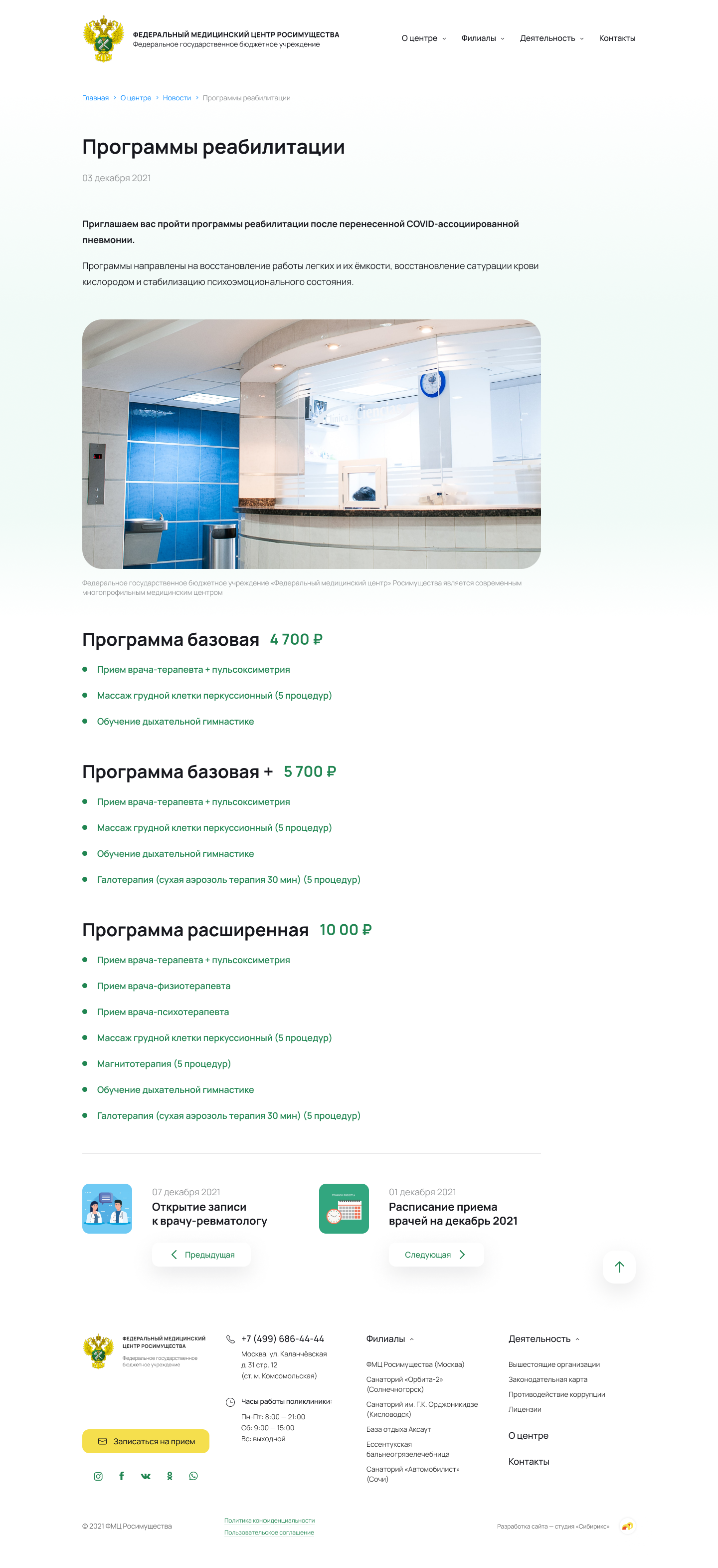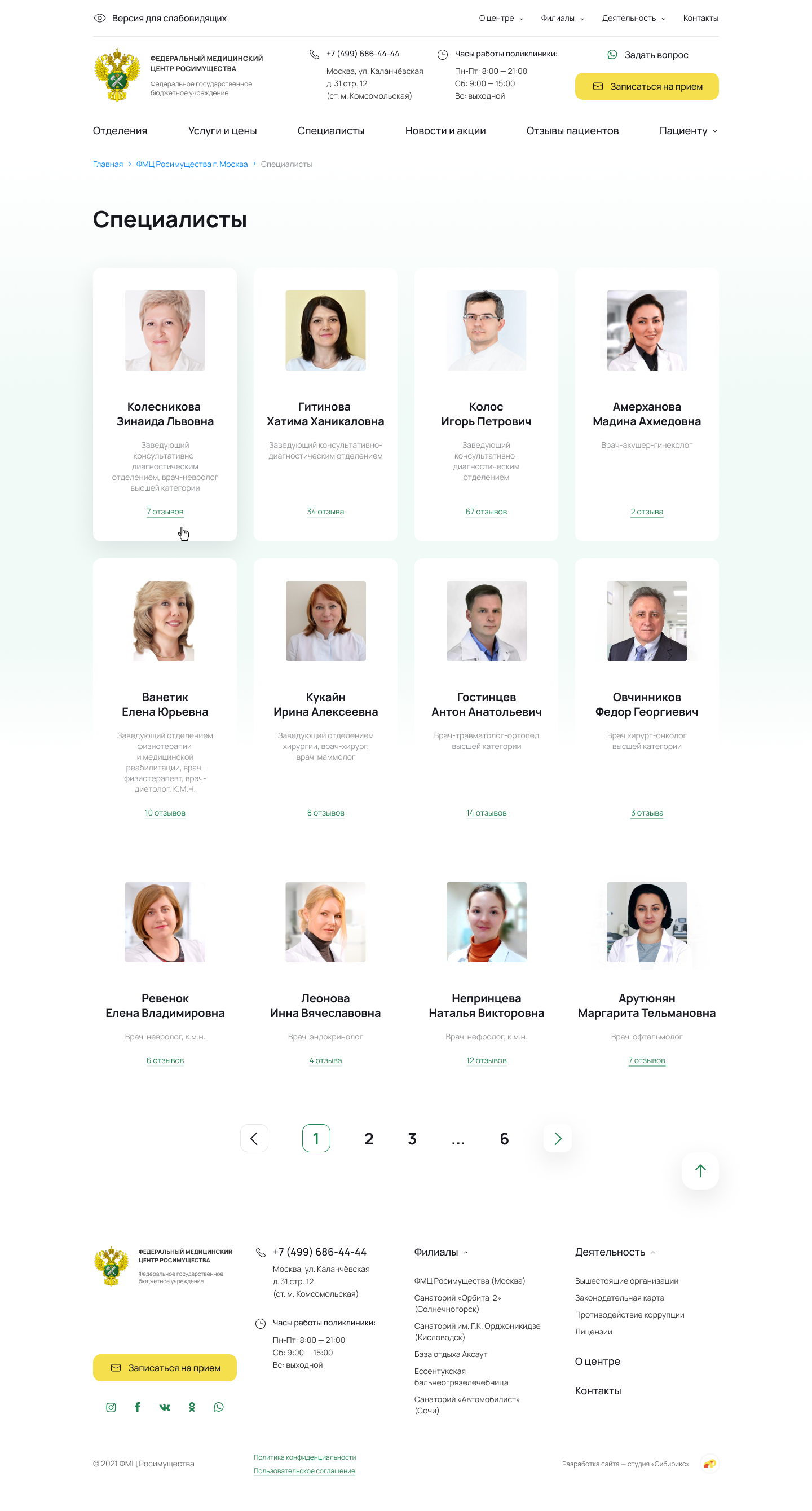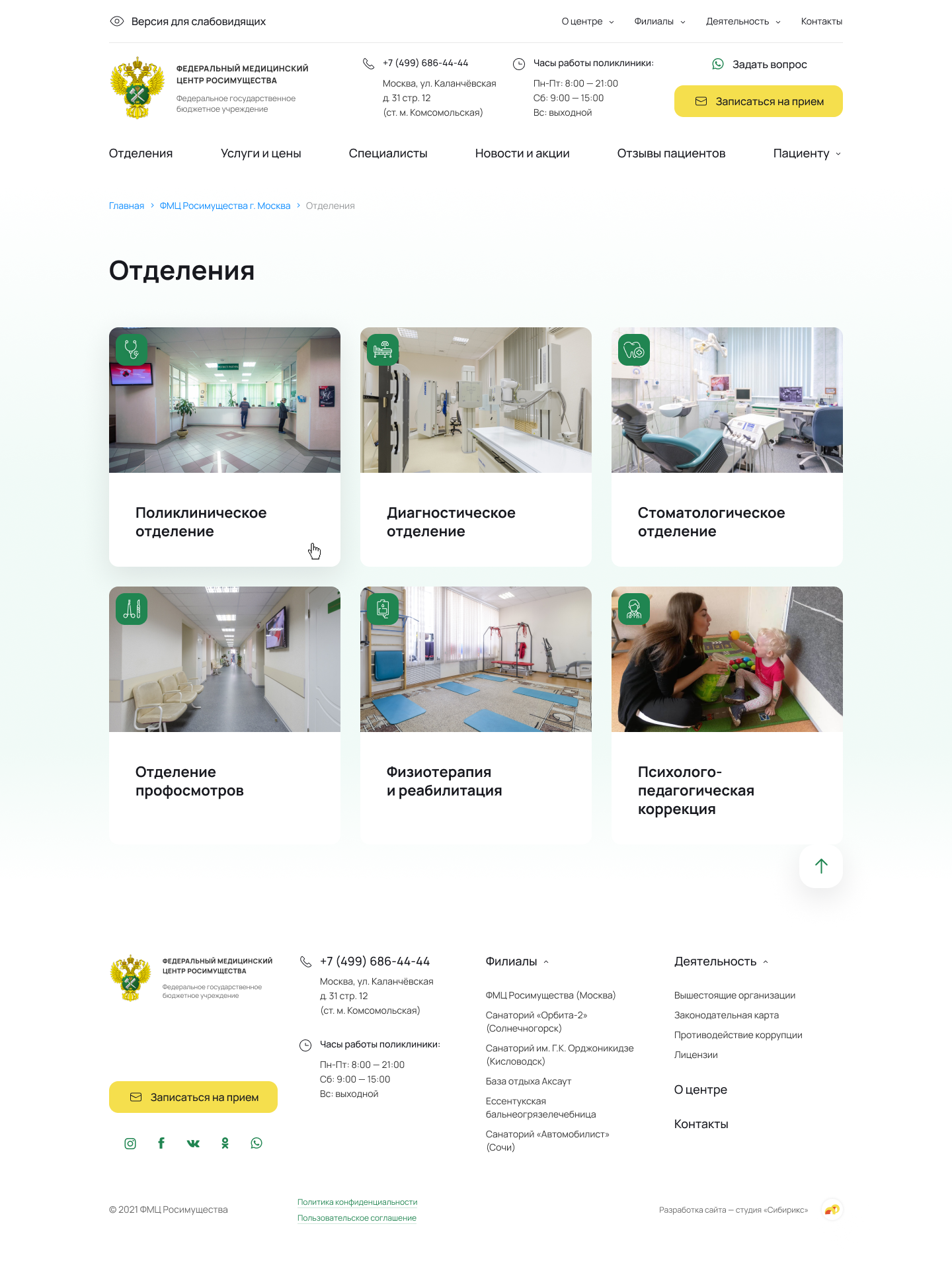 У медицинского центра в Москве — своя структура раздела: здесь и перечень отделений, и запись к специалистам, и свои новости. У каждого отделения центра — свой раздел с описанием услуг, специалистов и собственным прайсом.