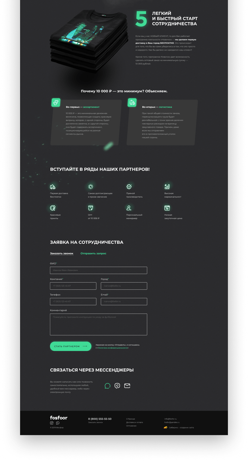 Страница «Оптовикам» представляет из себя полноценный яркий и эффектный лендинг, который пошагово описывает все преимущества сотрудничества с компанией Fosfor