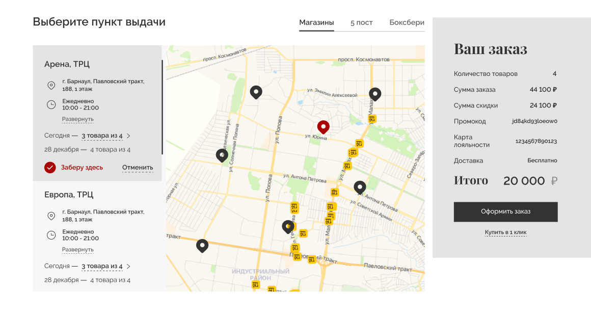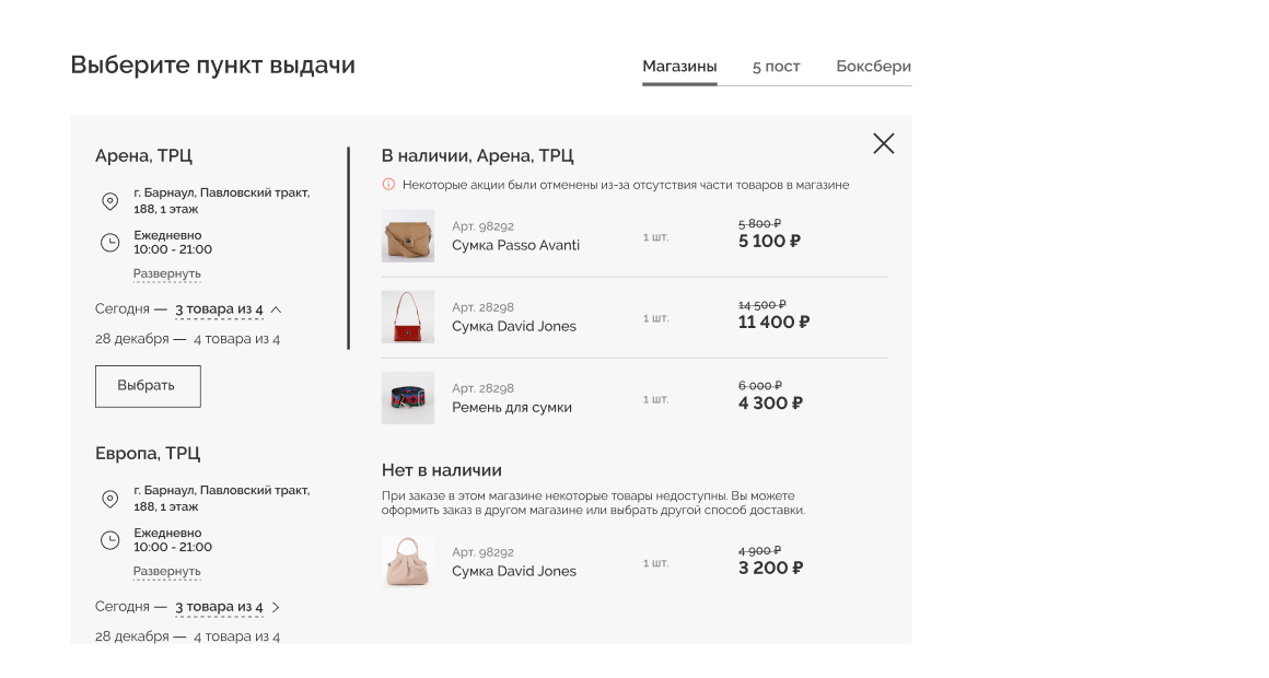 Вы можете заказать доставку курьером или забрать покупку в любом магазине «Империя сумок». Если в выбранном магазине нет нужного товара — мы проверим, можно ли привезти его из соседней торговой точки. Если да — пересчитаем срок получения с учетом этой доставки. Если нет — разделим заказ, чтобы вы могли заказать эту сумочку, например, курьером.