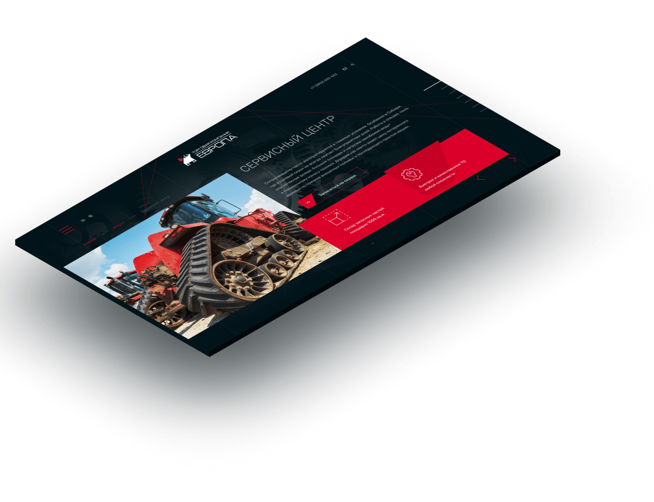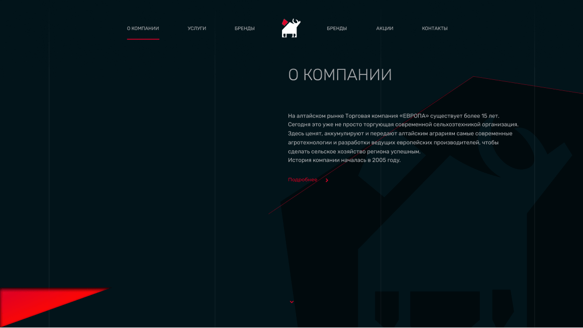 Тёмная тема — одна из фишек сайта. А угловатые красные элементы придают динамики и делают дизайн уникальным и запоминающимся.
