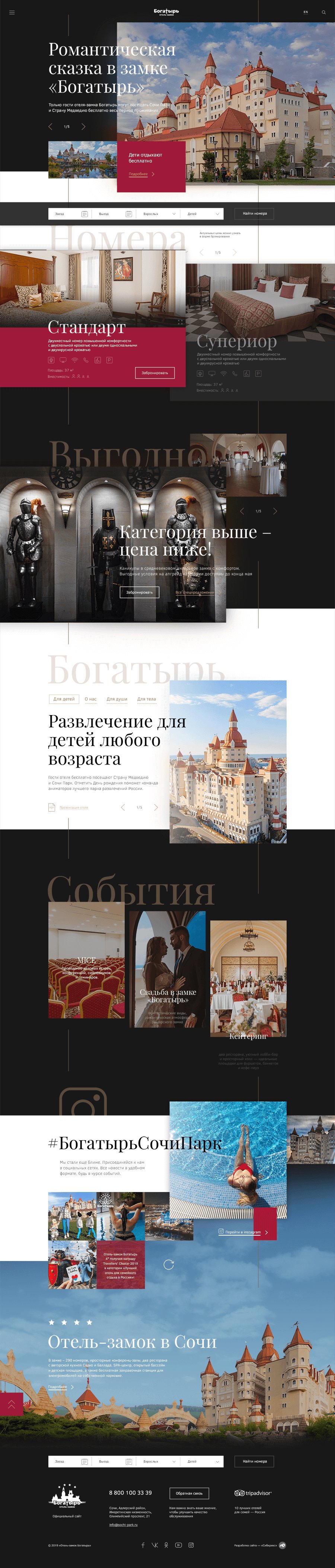 В дизайне мы оттолкнулись от названия — отель-замок — и предложили для параллакса элементы в средневековом стиле: кольчужная перчатка, свиток, щит. В основе дизайна — эффектное чередование светлых и темных тонов на странице.
