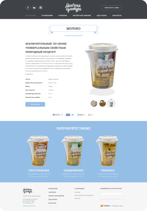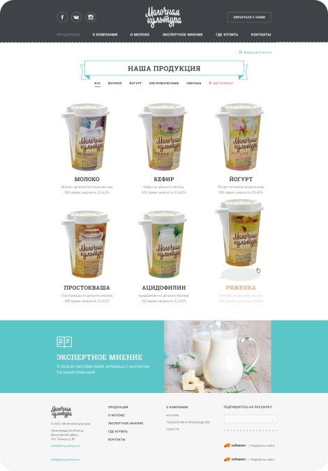 Что еще нужно для успешного сайта бренда? Добавляем каталог с цветовым кодированием разделов (цвет наследуется с главного слайдера). Проектируем страницу с нескучным рассказом о компании. Откуда, например, можно узнать, как с «Молочной культурой» связан барон Николай Корф, живший в начале 19-го века.