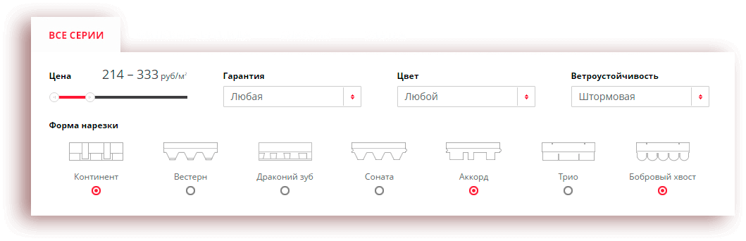 Было важно максимально упростить подбор черепицы для пользователей. Для этого решили использовать наглядный фильтр. Подобрать черепицу можно не только по цене и цвету, но и по типу гарантии, ветроустойчивости и форме нарезки.