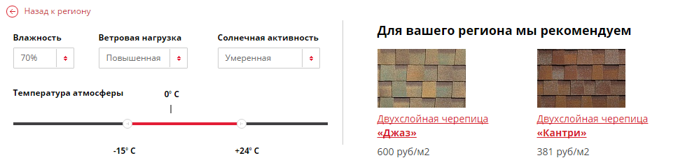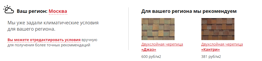 В паре с конструктором создана функция подбора климатических условий для использования черепицы (вообще-то они связаны с регионом пользователя и определяются автоматически, но их можно отредактировать и вручную, выставляя параметры влажности, яркости солнца и ветровой нагрузки, для получения более точных рекомендаций). Такой фишки нет ни у кого из конкурентов «ТехноНИКОЛЬ»!