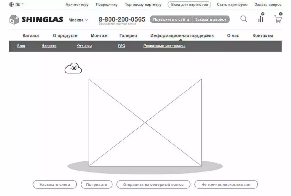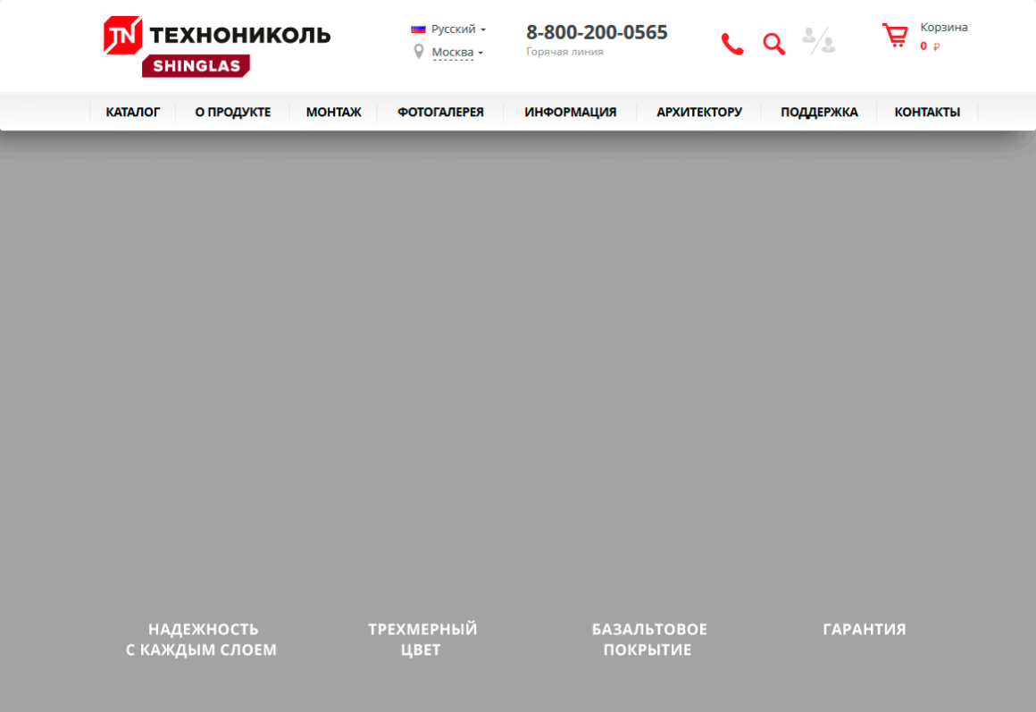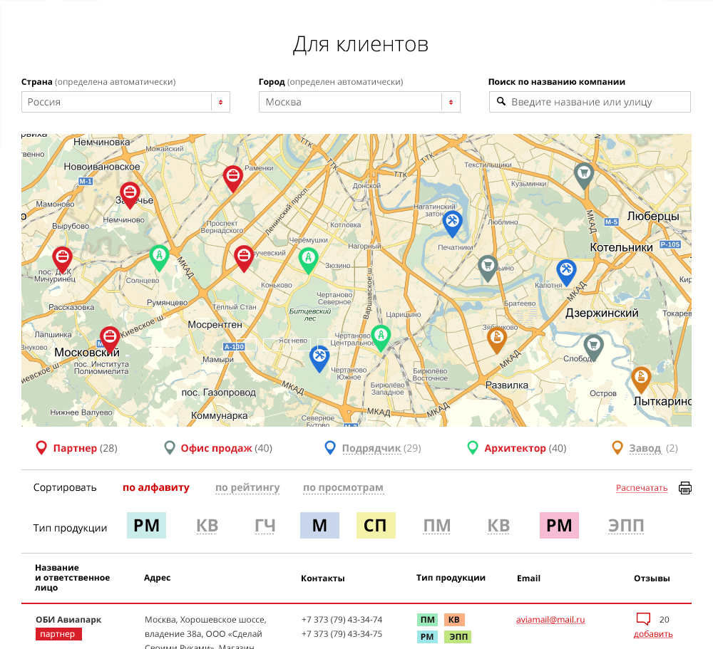 На сайте есть определение города по IP, что не совсем типично для корпоративного проекта. Это было нужно не только для фильтра климатических условий и отображения региональных новостей и событий, но и чтобы пользователь мог посмотреть адреса и контакты торговых партнеров, архитекторов и подрядчиков «ТехноНИКОЛЬ» SHINGLAS в своем городе. Всего в разделе «Контакты» около 2000 разных объектов!