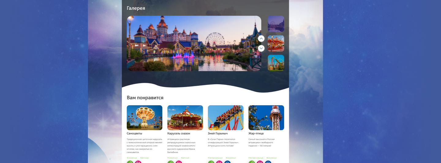 Создать интерактивный сайт для крупнейшего на территории России тематического парка развлечений для детей и взрослых. Перенести пользователя в мир сказки с волшебством и персонажами парка.