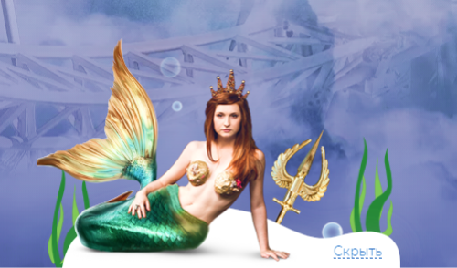 Если с погодой не везет, в парке действует тариф «Водяной», который также можно включить из административной панели. Появится русалка (естественно, тоже фото актрисы парка), которая при помощи CSS-анимации будет махать хвостом, лопать пузыри и сообщать о спецтарифе на сегодня.