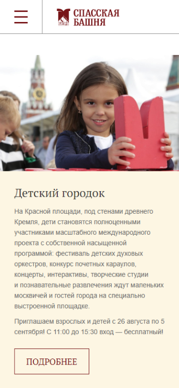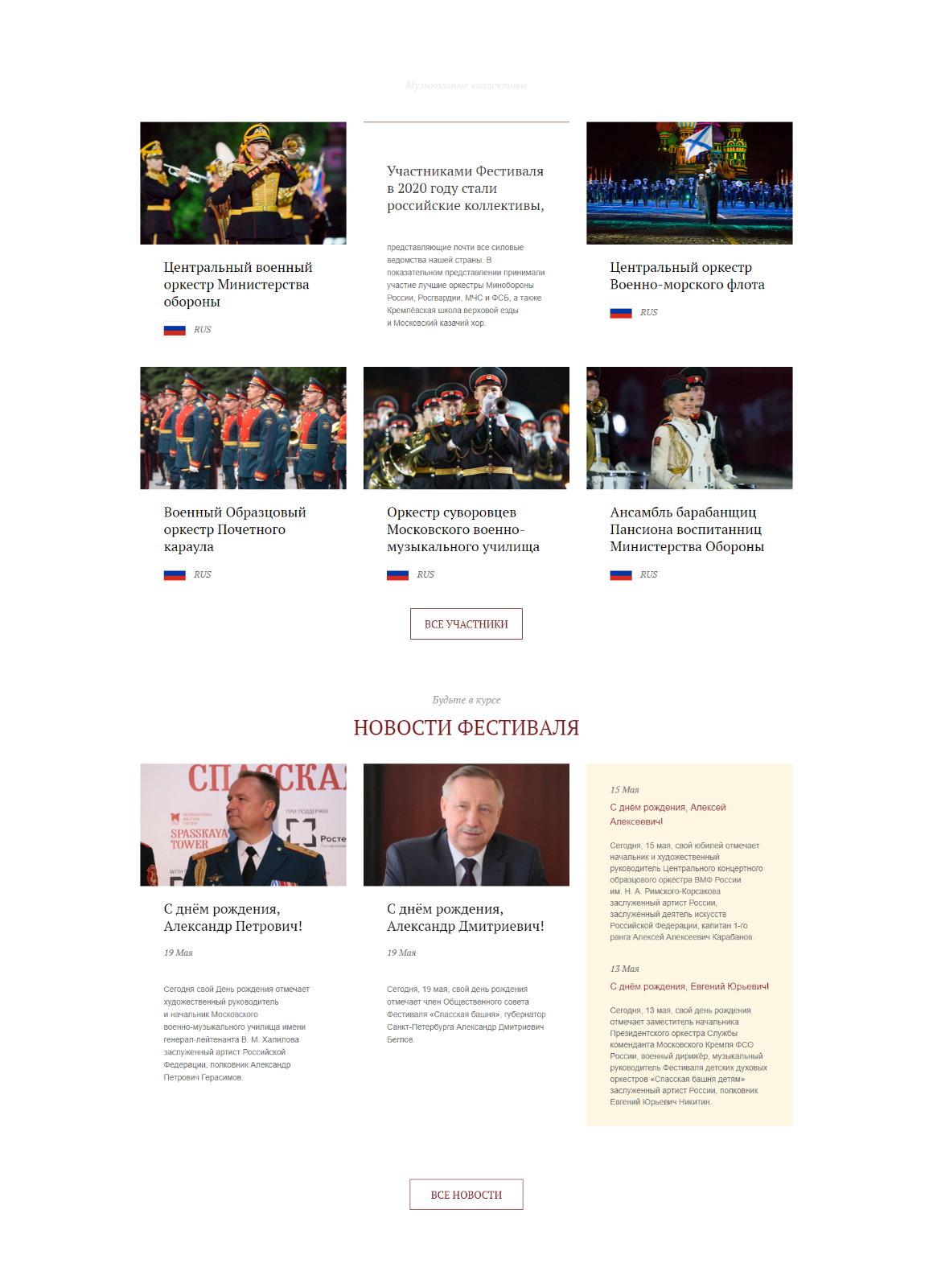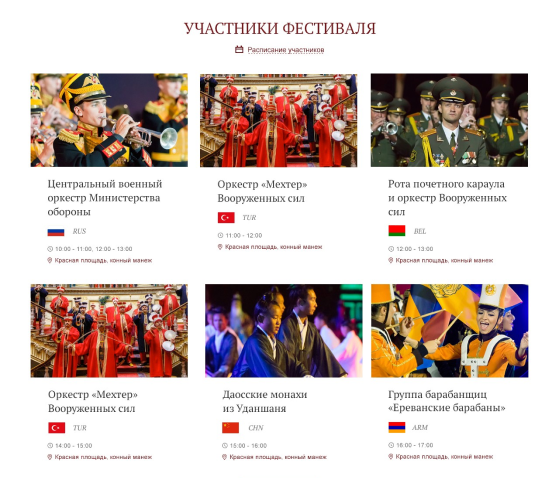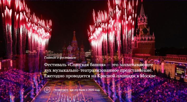 Международный военно-музыкальный фестиваль «Спасская башня» проводится ежегодно с 2007 года. За 10 дней, что он длится, на Красной площади успевают выступить до 33 коллективов из России, Китая, Казахстана, Шотландии и других стран. Тысячи человек из разных городов и стран собираются, чтобы увидеть и услышать их.