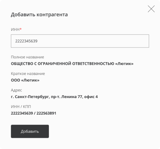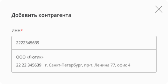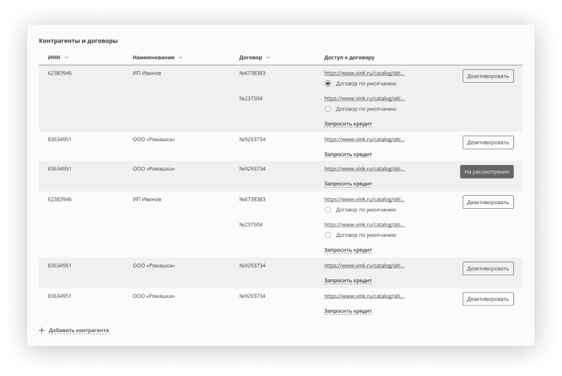 В личном кабинете у компании может быть несколько контрагентов. Администратор компании может добавлять или деактивировать контрагентов. При добавлении мы ищем компанию в справочнике адресов и компаний DaData по ИНН и наименованию — обмануть сайт и добавить кого-то несуществующего просто не получится.