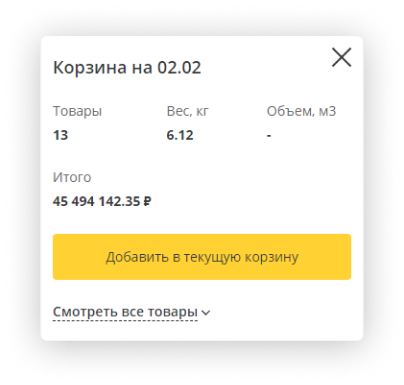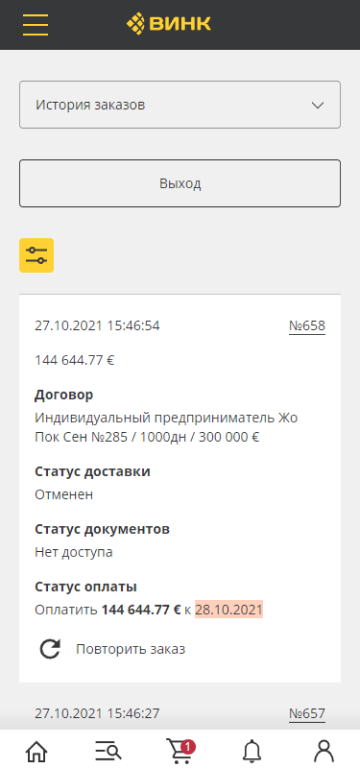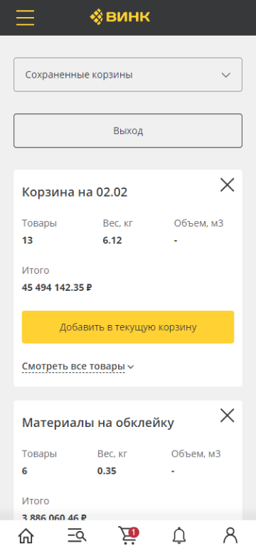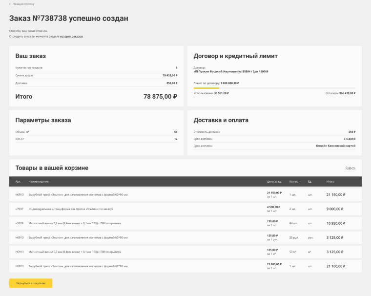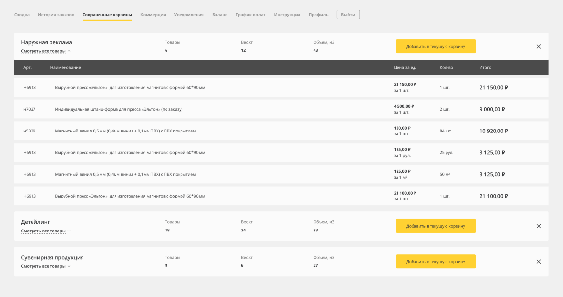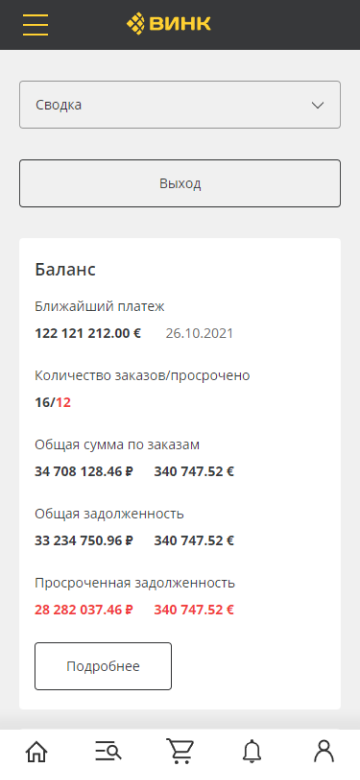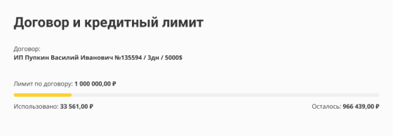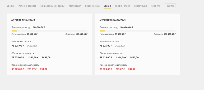 Если у пользователя есть кредитный договор – в корзине появится индикатор и данные по расходованию средств и остатками по лимиту. Покупатель видит товары именно в той валюте, которая предусмотрена его договором. Можно сохранять корзины — один сотрудник компании может собрать заказ, сохранить корзину, а другой — оформит заказ.
