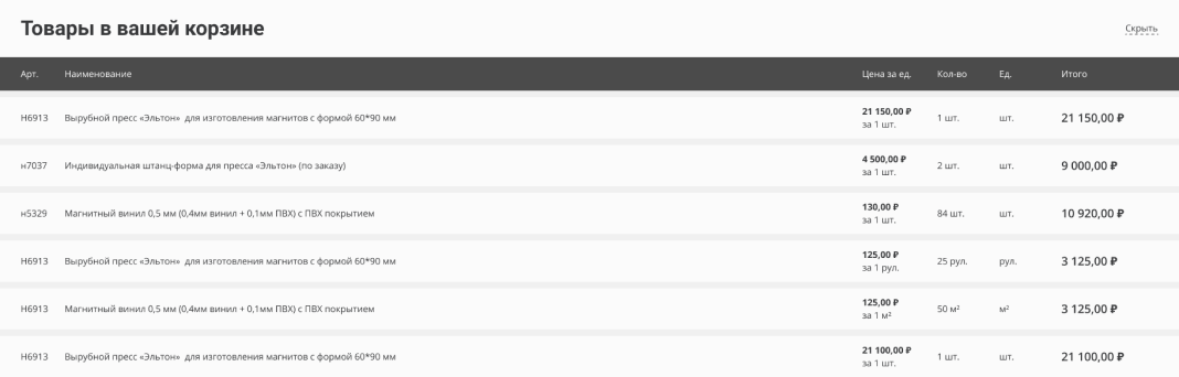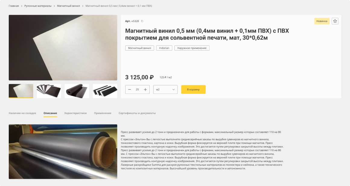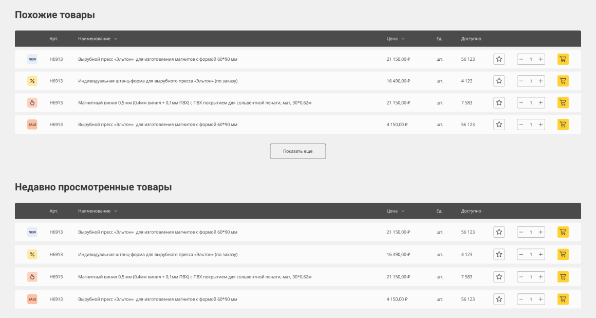 В2В-интернет-магазин требует особого подхода к карточкам товара. В отличие от B2C-площадок, где важнее всего эффектно показать товар, тут заказы могут содержать сотни позиций. Пользователям собирать корзину гораздо удобнее, когда карточки максимально лаконичные.