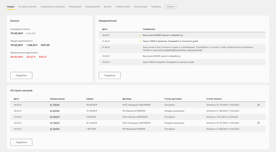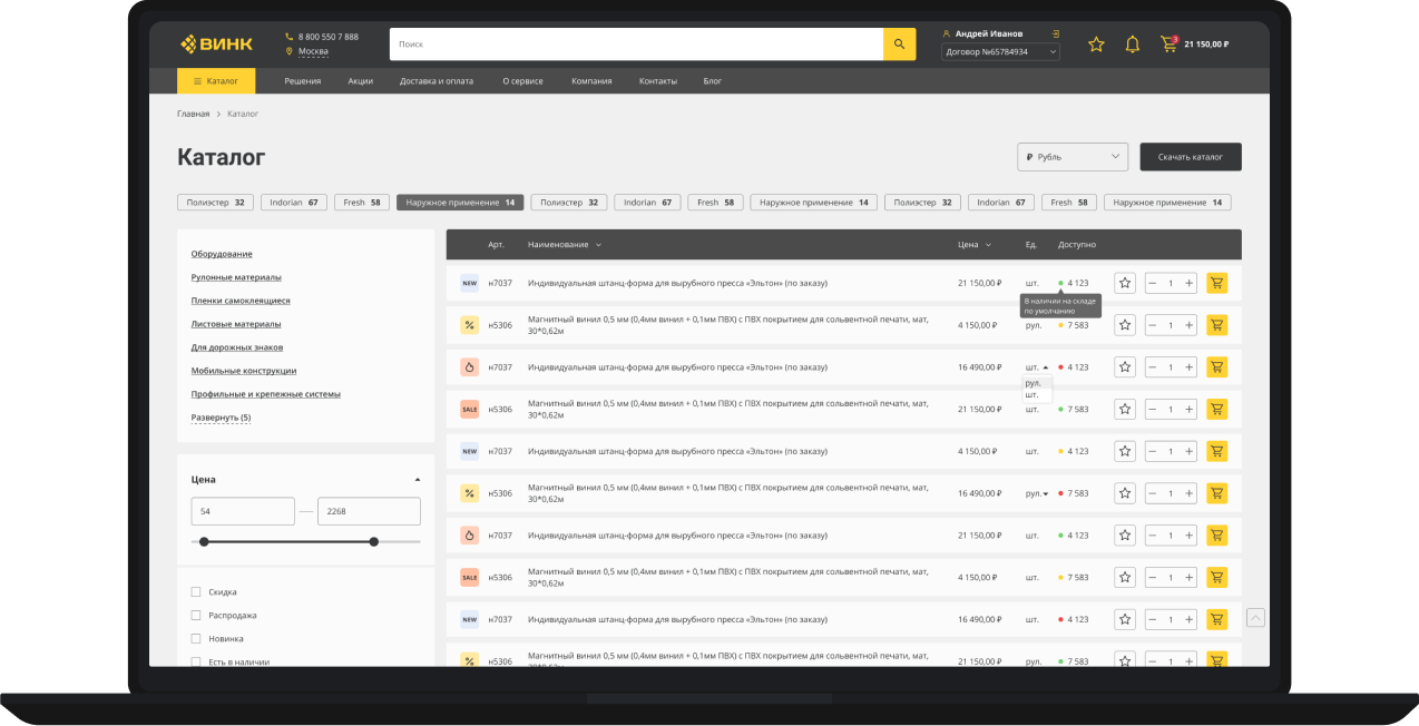 «Винк» — крупный оптовый поставщик материалов и оборудования для создания рекламных носителей. Его продукцию используют для создания наружной рекламы, широкоформатной цифровой печати и оформления торговых и общественных пространств. Работа с оптовыми клиентами подразумевает сложные бизнес-процессы — индивидуальные условия, нетривиальная логика доставок, продажа товаров в разных валютах. Нам предстояло сделать интерфейс простым и удобным :)