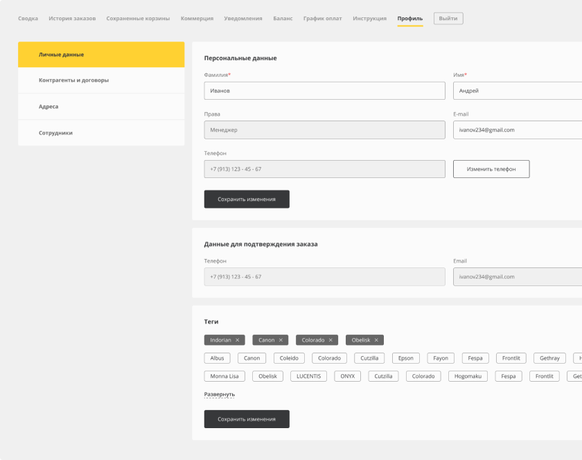 Администратор может управлять доступом сотрудников к разделам кабинета компании. А еще – устанавливать режимы для групп пользователей, прямо как в Гугл-документах: без доступа, только просмотр, редактирование. Благодаря этому в рамках одного личного кабинета может работать несколько пользователей с разными правами. А заказы от них будут отображаться в общем списке в истории заказов.