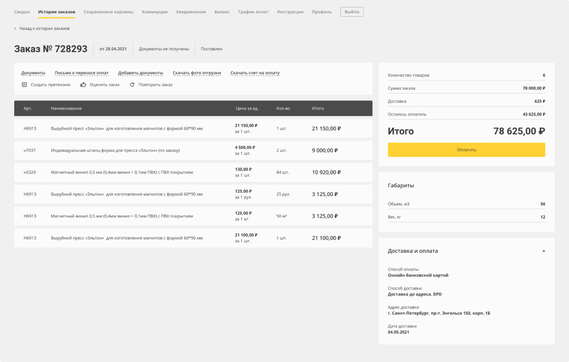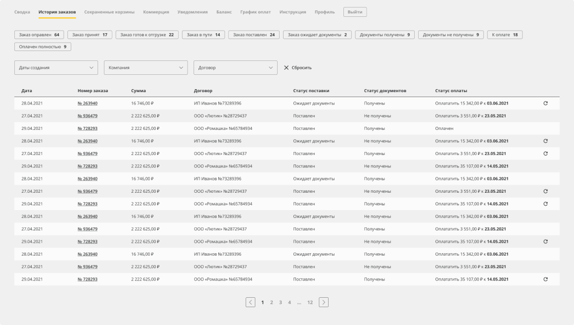В истории заказов мы показали максимально детальную информацию, ведь внутри одного личного кабинета заказы могут совершаться разными пользователями и по разным договорам. Заказов может быть много, поэтому предусмотрели фильтр: