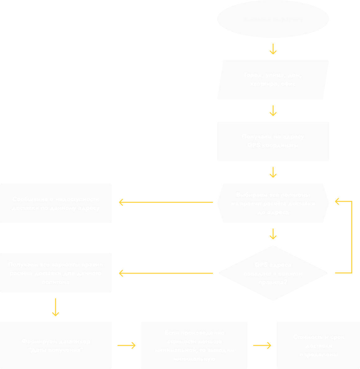 На этапе разработки мы столкнулись с нестандартной и сложной логикой доставки. Доступные даты и стоимость доставки зависят от города, времени оформления заказа, даты и склада, с которого будет осуществляться отгрузка. Поэтому мы использовали классический инструмент, позволяющий наглядно показать все зависимости, разработав блок-схему бизнес-процесса для каждого из трех доступных на сайте типов доставки.